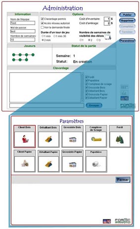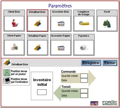 La fenêtre des paramètres n’est accessible qu’à l’administrateur de la partie. Elle lui permet de déterminer les valeurs de départ de la partie et de dicter le comportement des positions jouées par l’ordinateur selon des règles préétablies.