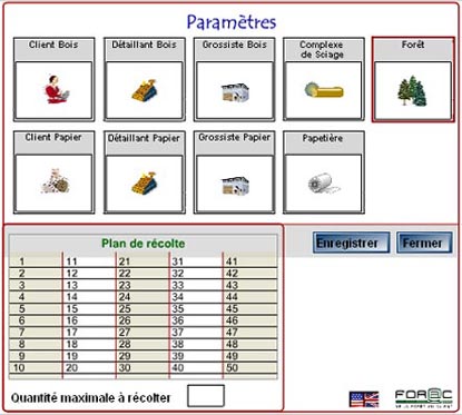 L’administrateur peut y entrer les valeurs minimum et maximum à récolter pour chaque semaine de jeu. La quantité maximale qui peut être récoltée pendant toute la durée du jeu doit aussi être spécifiée à cet endroit.